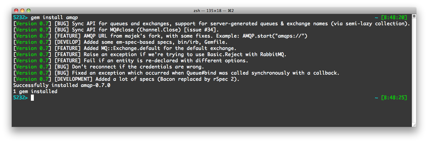 Speaking about them, I'd really want to thank all the contributors, their work really helped to get the AMQP gem where it is now. Since the beginning 22 people contributed to the project, and 5 of them have more than 5 commits. Check the CONTRIBUTORS file for more details!